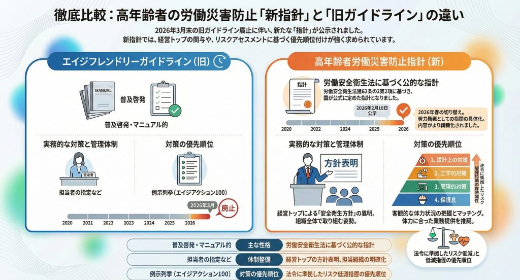 • 旧ガイドライン: 高年齢労働者が安心して働ける環境づくりや健康づくりを推進するために、事業者や労働者が取り組むべき事項を示したものでした。なお、旧ガイドラインは令和8年3月31日をもって廃止されます。